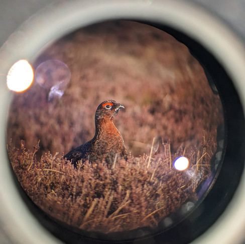 Around us are Curlews calling, Wren singing and Redpolls flying overhead. After enjoying the Black Grouse lekking for a good thirty minutes, we move on. Heading north again, we come to a heather moorland. Turning again onto an even smaller single track, we roll down the windows and drive slow. Meadow Pipits are displaying, and we can hear Skylarks singing. I point out the shapes we are looking for here and what we might see. A loch comes into sight, and we pull up into a parking spot. As soon as we get out the car, the guests point to a single male Red Grouse, feet from the minibus, he doesn’t seem to be bothered about us at all. Moving to the back of the minibus, we set our scopes on him, not that we need to, but at this distance, we can really see every feather.